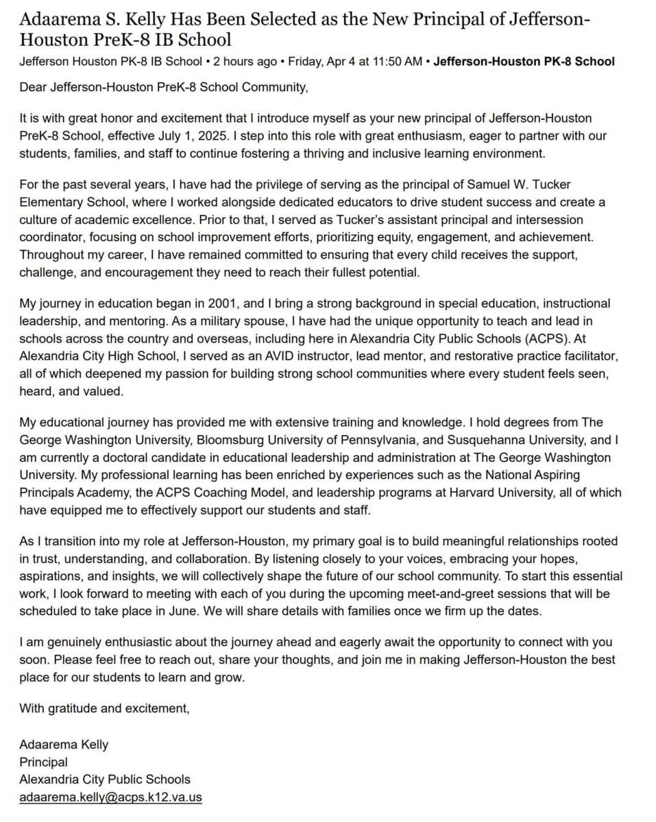 “Adaarema S. Kelly will join Jefferson-Houston PreK-8 IB School as its new principal, effective July 1, 2025. Kelly is a transformative educational leader who leads from the heart, driven by a deep commitment to student success and lasting school improvement,” ACPS shares in an announcement on their website. “With a proven track record of improving student outcomes, fostering a positive school culture and strengthening community partnerships, she has served as principal of Samuel W. Tucker Elementary School (Tucker) since 2022 and has led significant academic growth, increased student engagement and improved school climate. Prior to that, she served as the assistant principal and intersession coordinator at Tucker since 2017, where she played a key role in developing and managing the school’s improvement plan”.