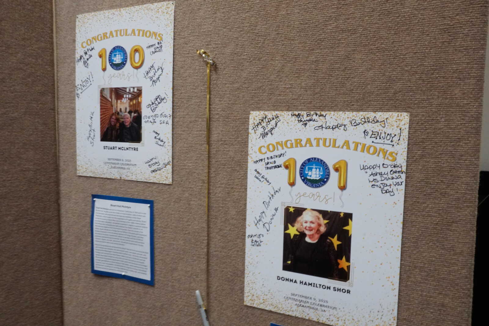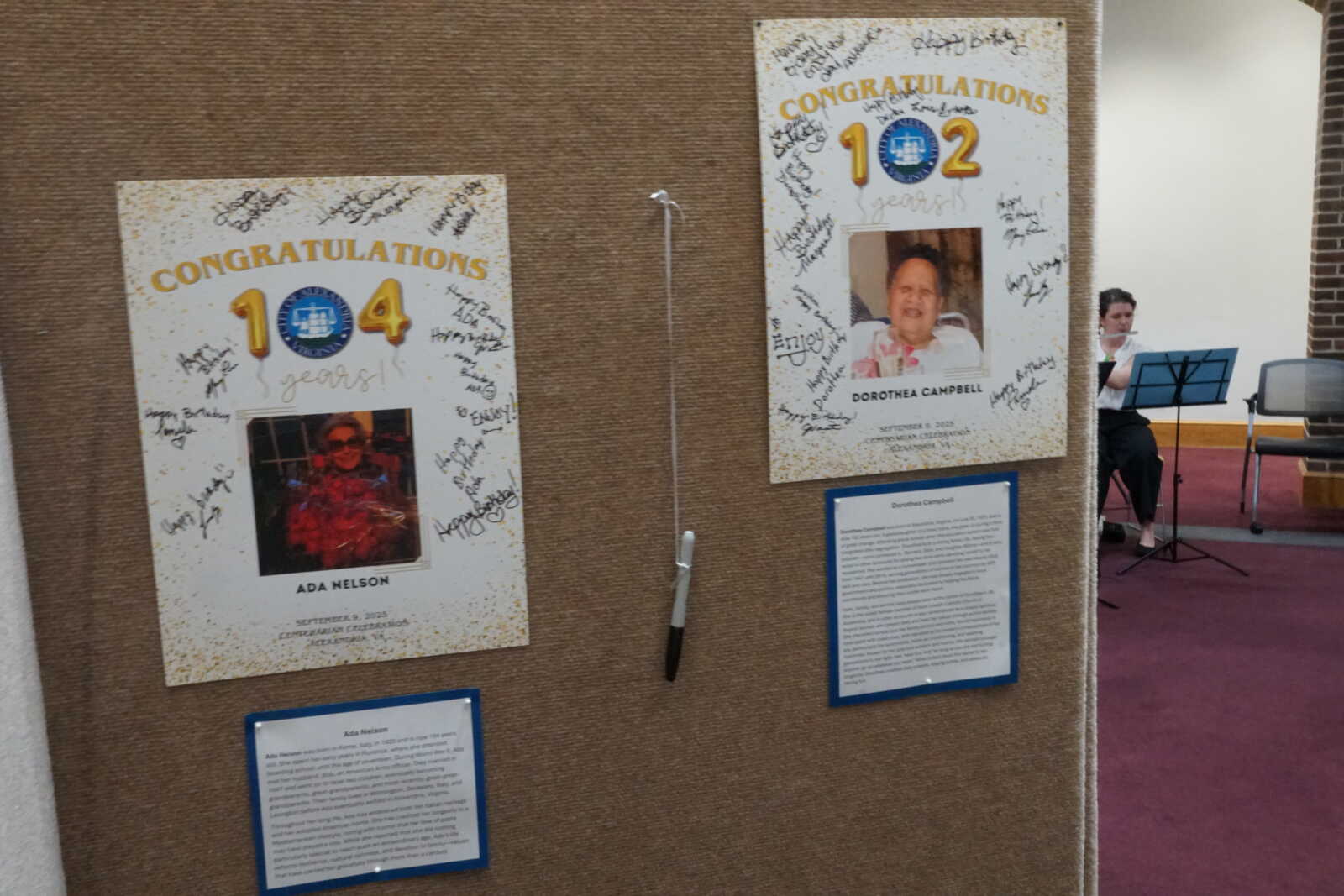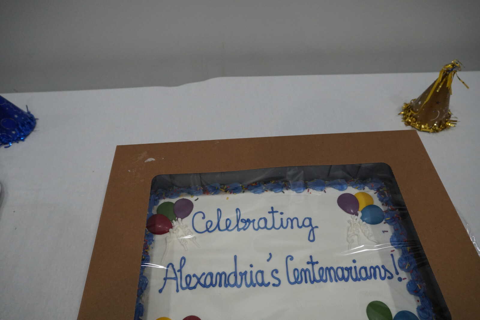The event, held in the Vola Lawson Lobby, honored residents age 100 and older with personalized birthday displays, music from the Alexandria Citizens Band, and a decorated sheet cake reading “Celebrating Alexandria’s Centenarians!”