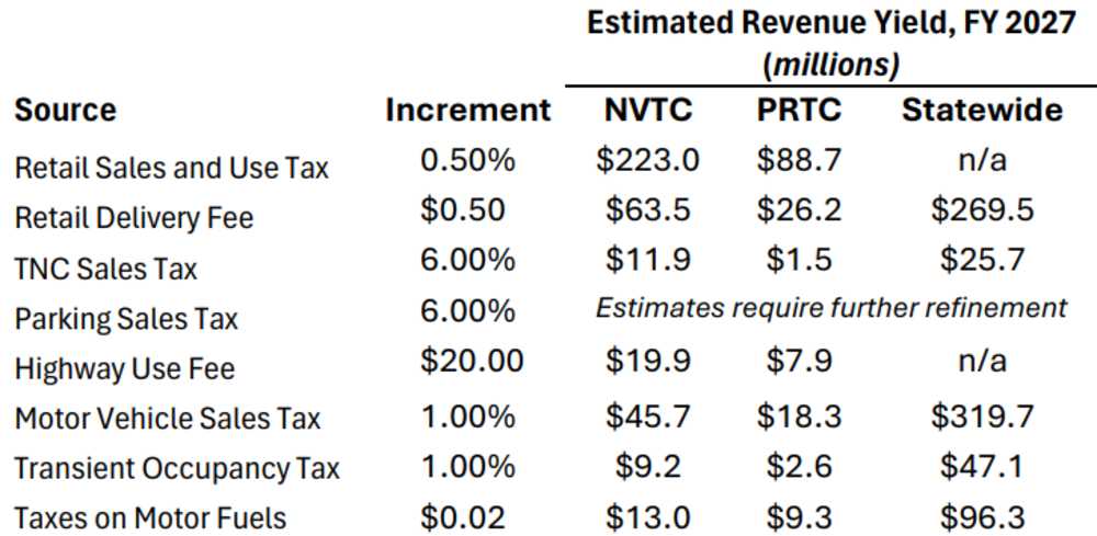 Potential funding streams include increases to the sales tax, motor vehicle sales tax, motor fuels tax, highway-use fee and transient-occupancy tax, and new taxes and fees on retail deliveries, paid parking and rideshare services.