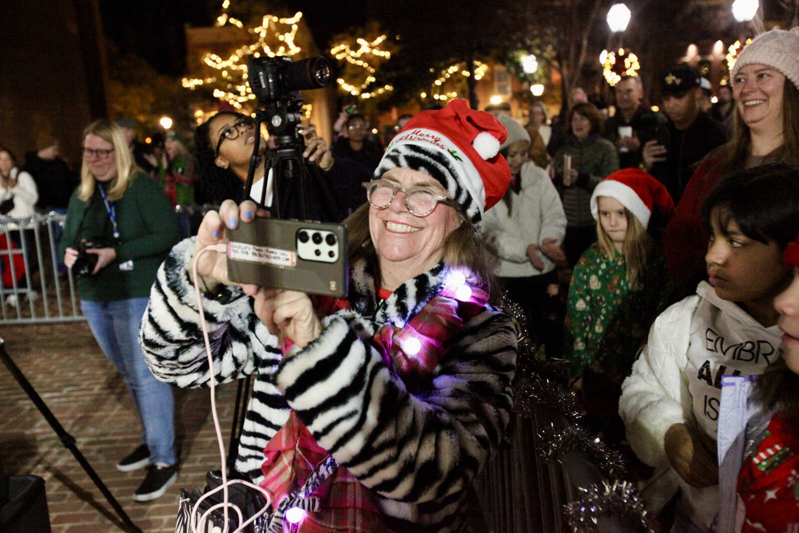 Lucelle O’Flaherty takes pictures at the Alexandria Christmas tree lighting at Market Square, Nov. 22, 2025 (staff photo by James Cullum)