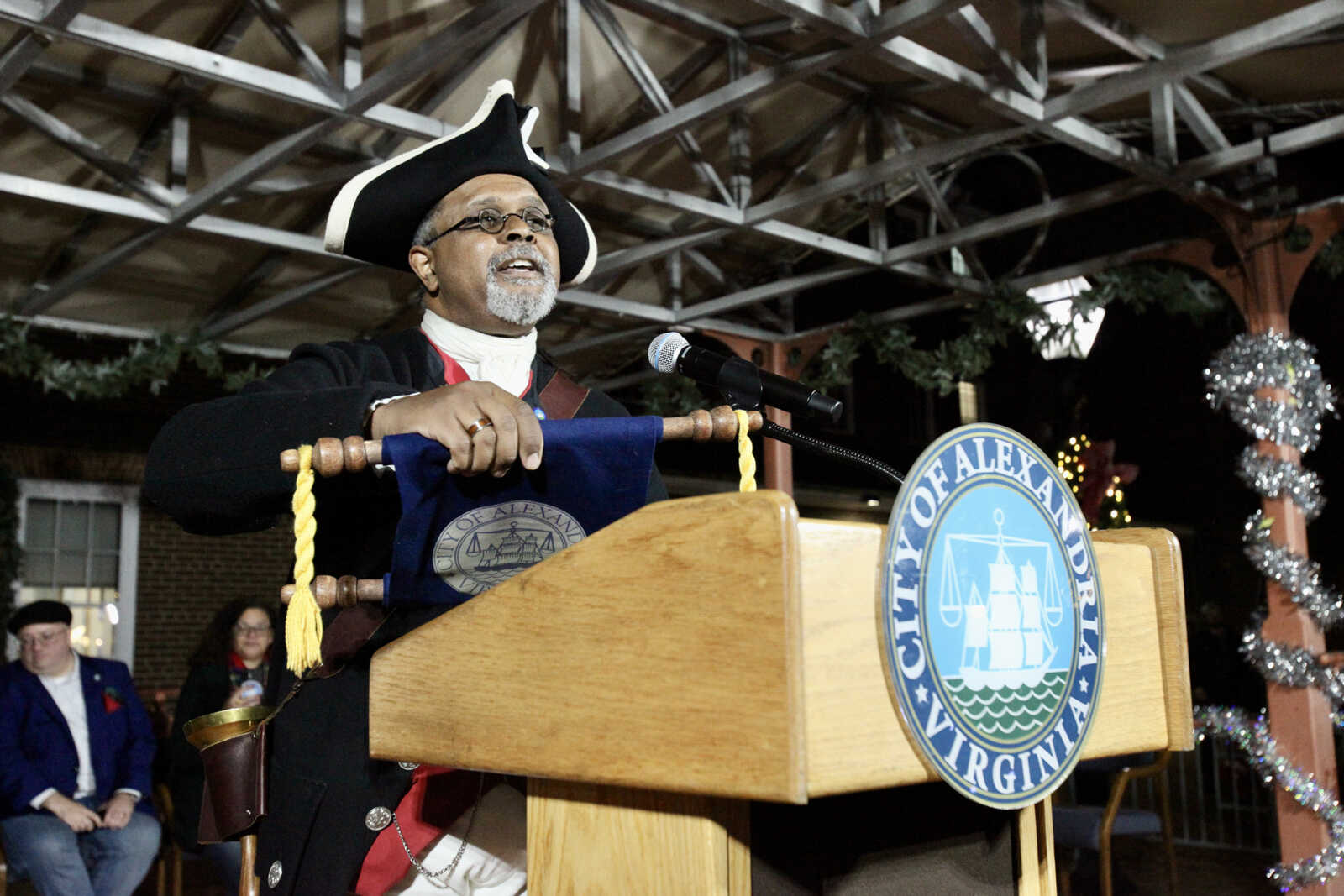 Town Crier Ben Fiore-Walker at the Alexandria Christmas tree lighting at Market Square, Nov. 22, 2025 (staff photo by James Cullum)
