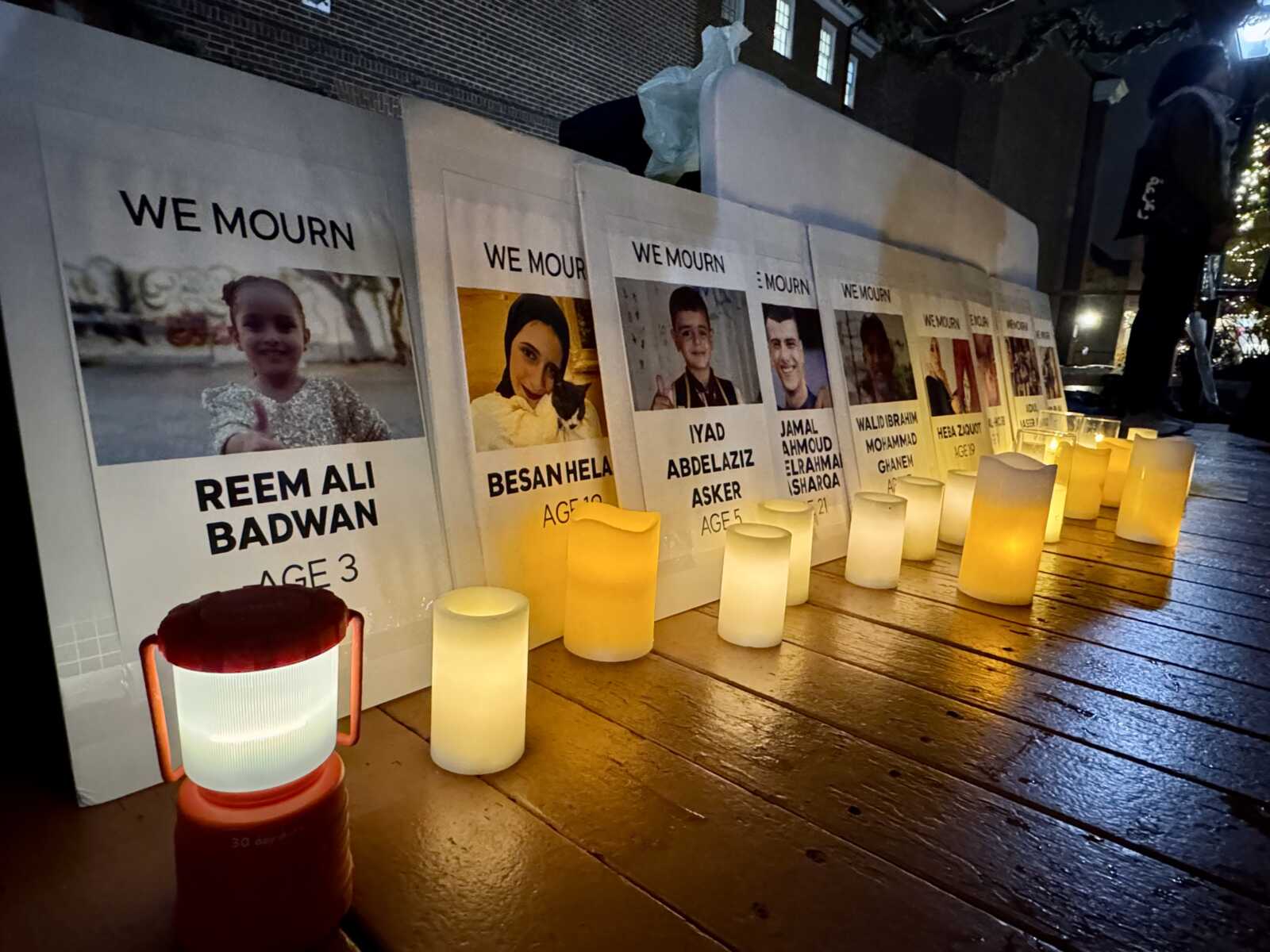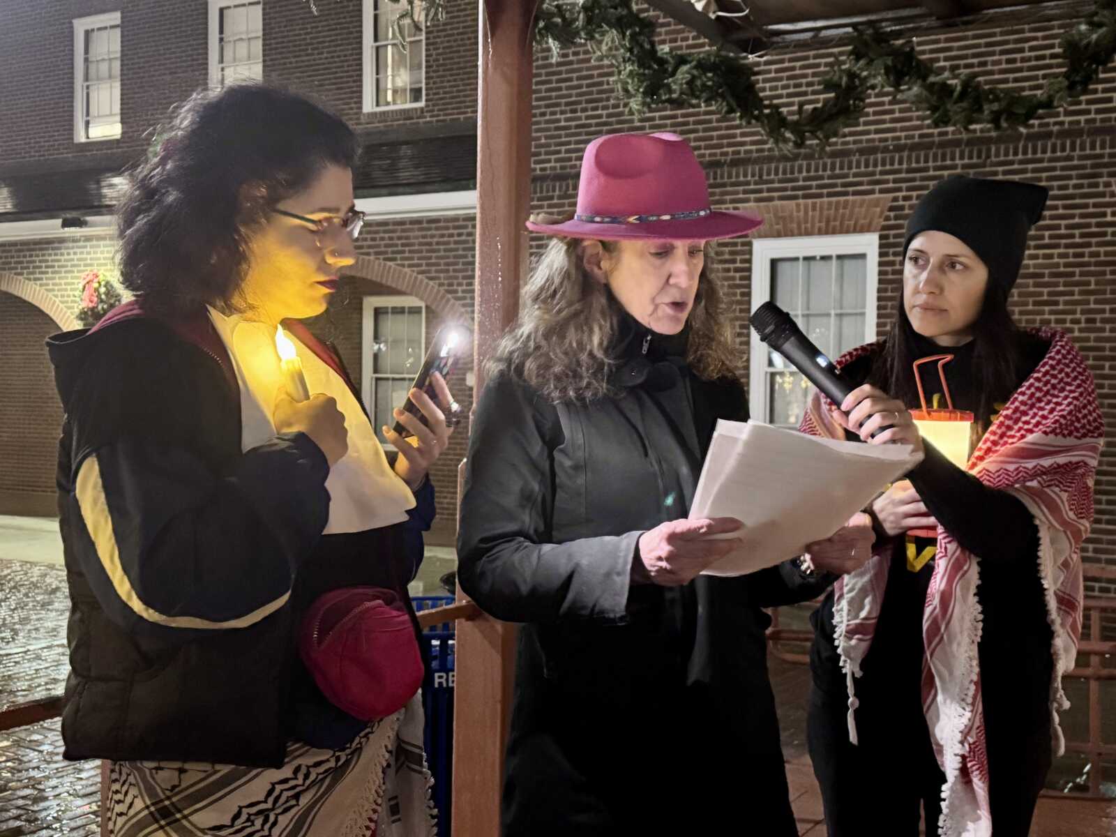 Standing under the covered stage outside City Hall at Market Square on Tuesday night, members of Alexandria for Palestinian Human Rights and their supporters held a candlelight vigil and sang songs, read poems and asked the city to stop working with companies they accuse of war profiteering.