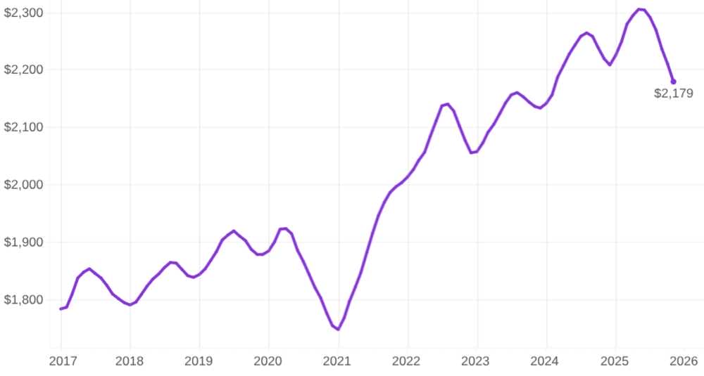 The city’s median apartment-rental rate in November was $1,996 for a one-bedroom unit, $2,452 for two bedrooms and $2,179 for all units, according to the monthly data analysis by Apartment List.