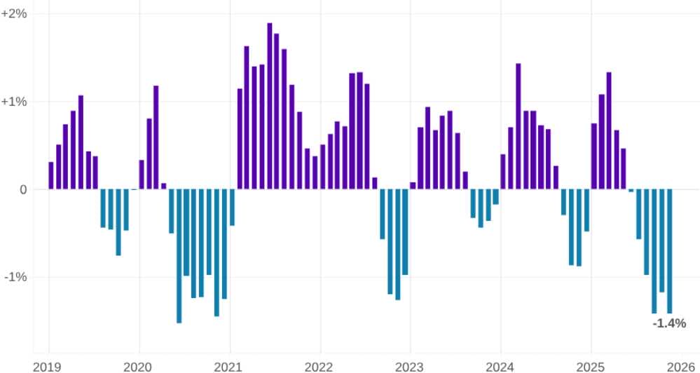 - “Rent prices nationally are down 1.1% compared to one year ago. Year-over-year rent growth has been slightly negative for over two full years, and the national median rent has now fallen from its 2022 peak by a total of 5.2%”