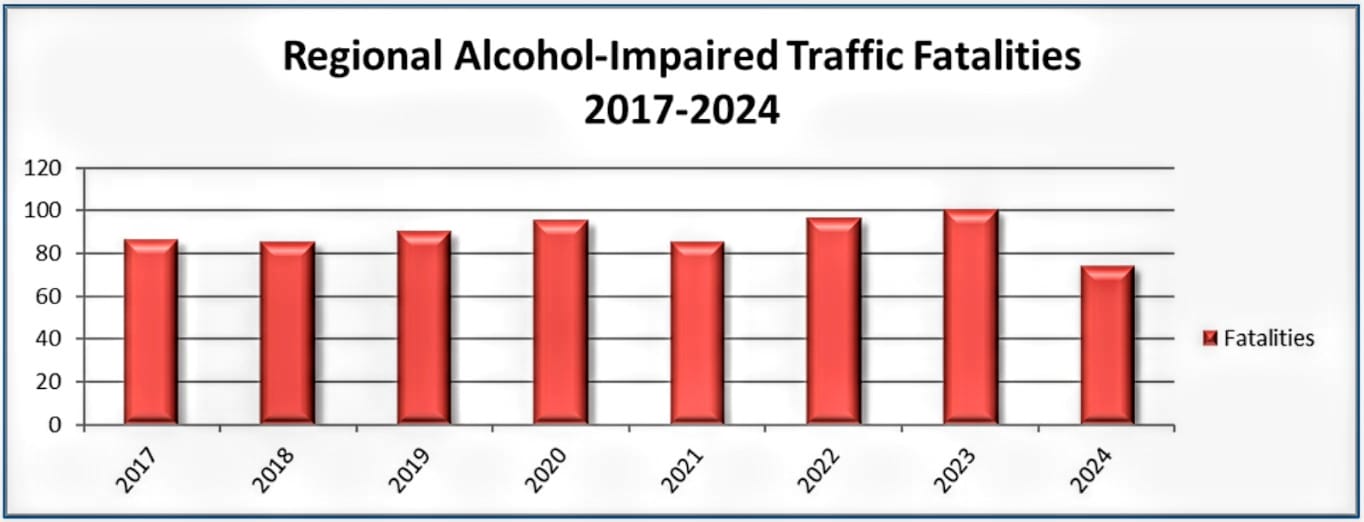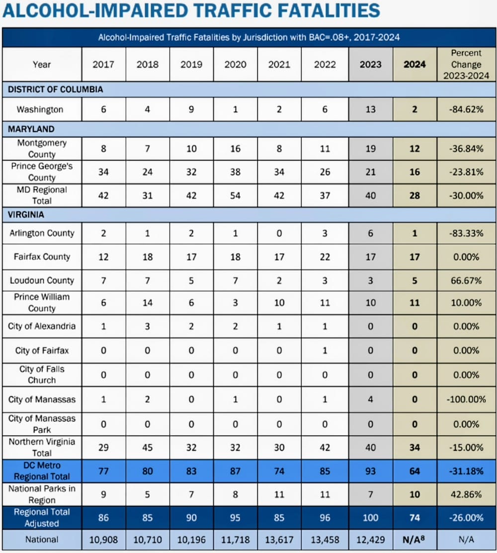 Regional deaths connected to impaired driving were down 26% from 2023 to 2024, according to a report by the Washington Regional Alcohol Program (WRAP) and Metropolitan Washington Council of Governments. The report recorded 74 fatalities connected to alcohol- and/or drug-related crashes last year — down from 100 recorded in 2023 and below the five-year average of 90.