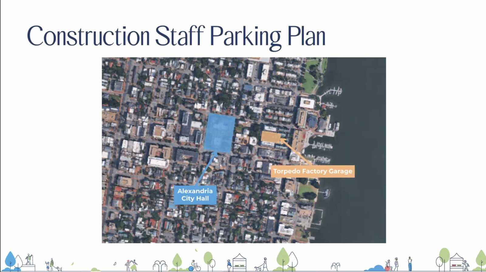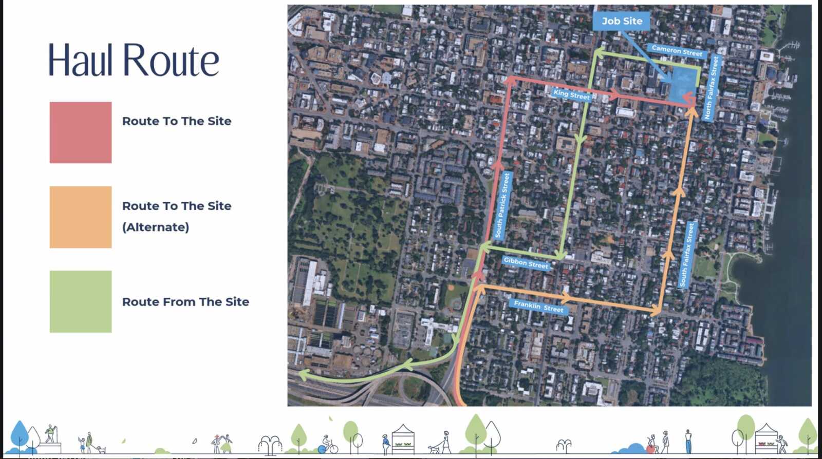 Crews plan to park in the Torpedo Factory Art Center’s garage. Trucks and other large vehicles on the project’s haul route intend to travel off of Interstate 495 and across King, Fairfax, Cameron and Washington streets.