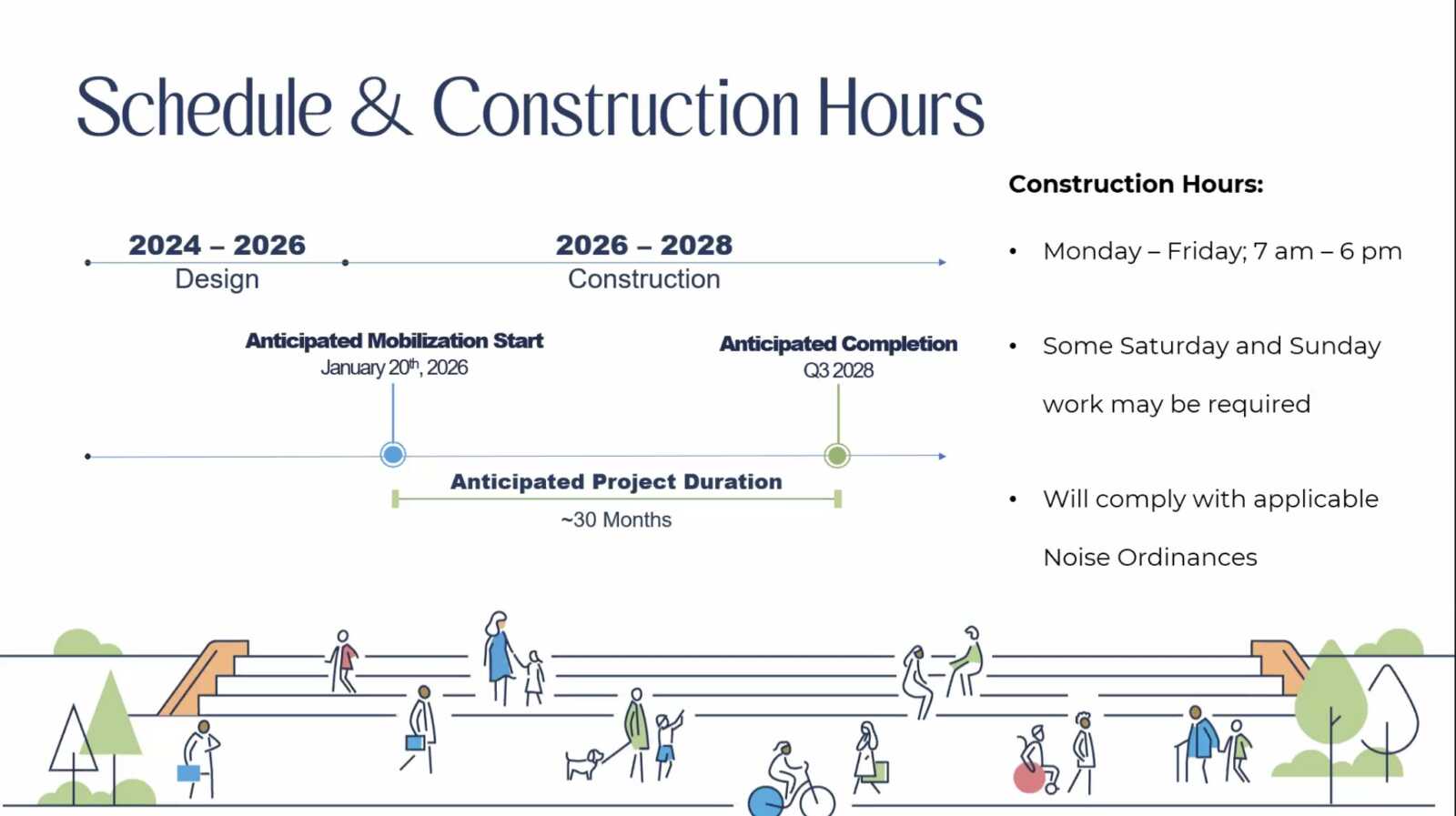 Starting Jan. 20, crews will work on the construction site from 7 a.m.-6 p.m. daily, and “some Saturday and Sunday work may be required,” according to a city presentation.