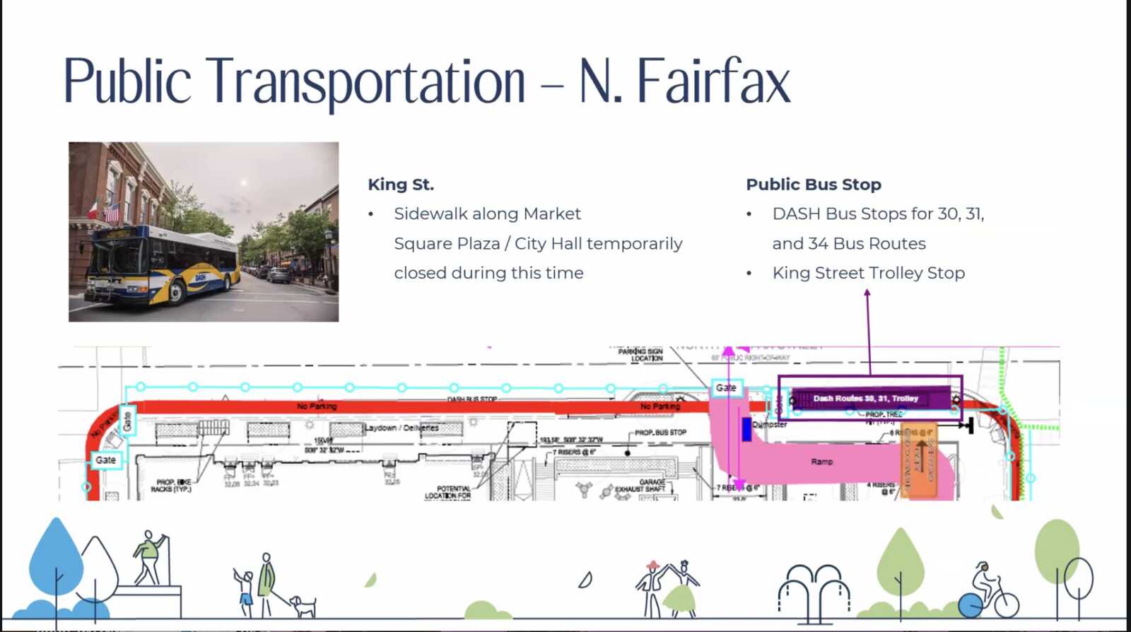 Construction will also lead to some bus stop alterations. The site’s DASH bus stops for routes 30, 31 and 34 will combine into a single stop on King Street that will also service the King Street Trolley.