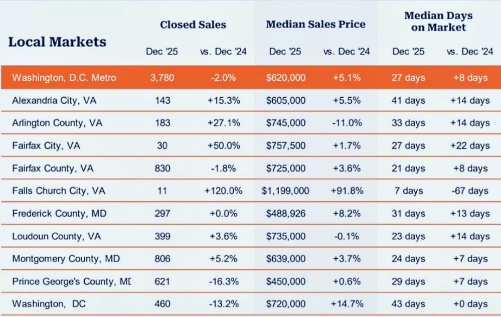 Regional home sales down, prices up in 2025: Across the Washington region in 2025, sales totaled 49,408, down 1.1% from 49,942, according to Bright MLS.