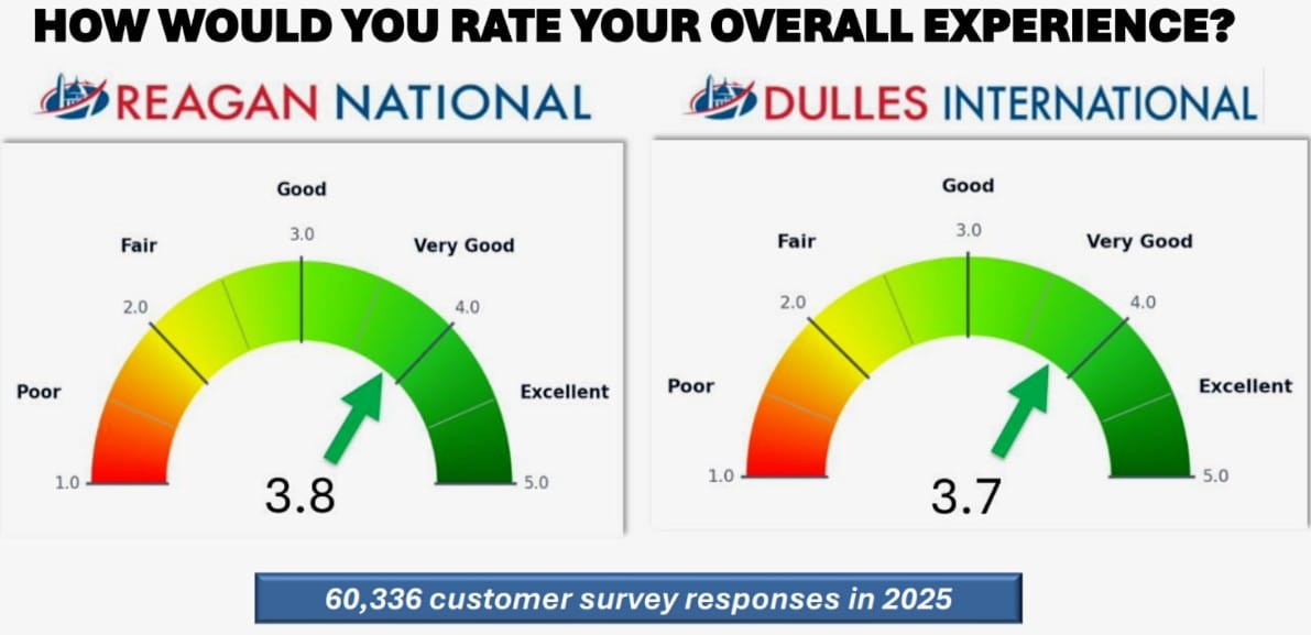 Based on more than 60,000 surveys completed by travelers throughout the year, Reagan National scored 3.8 on a 1-to-5 scale, with Dulles coming in at 3.7 via the MWAA survey.