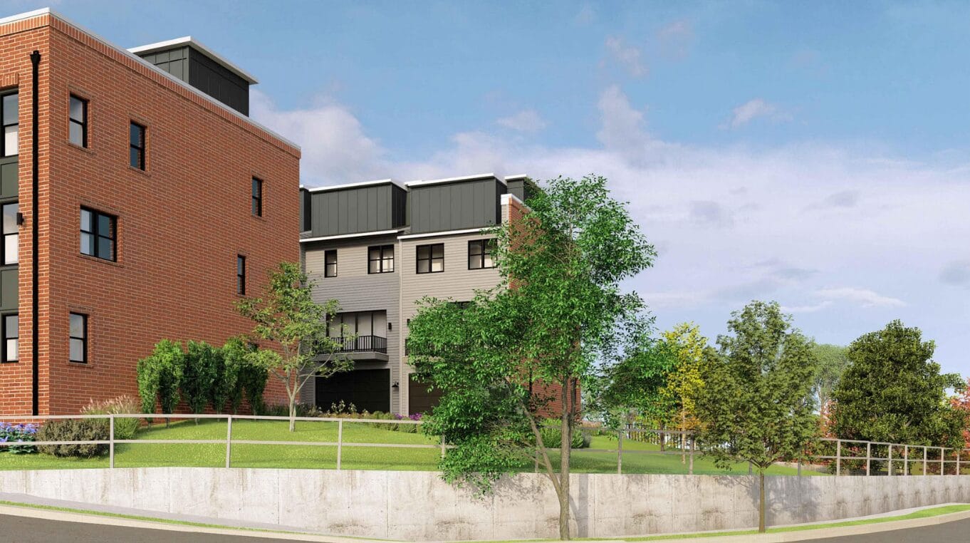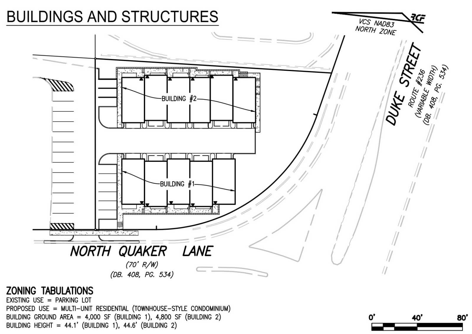 Development company 614 Westbrad, LLC, wants to build 45-foot-tall three-story townhomes with roof-level lofts, terraces, and parking garages at 11 N. Quaker Lane, 21 N. Quaker Lane and 3369 Duke Street.