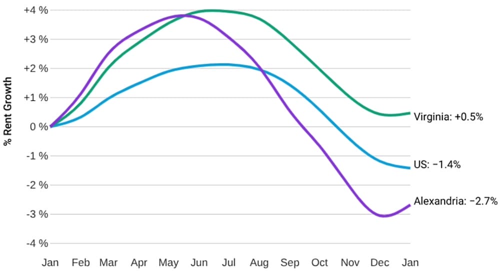 Alexandria’s year-over-year decline was steeper than that of the metro area as a whole (-1.8%) and neighboring Arlington (-1.6%). Virginia saw a 0.5% increase in median apartment rental rates year-over-year in January, while the national median rate declined 1.4%.