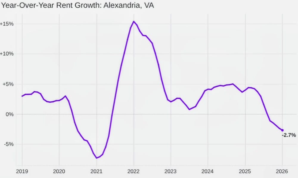 Median Alexandria rents dropped 2.7% from January to December 2025, the first annual decline since the 7% drop in 2020 as the Covid pandemic roared in.