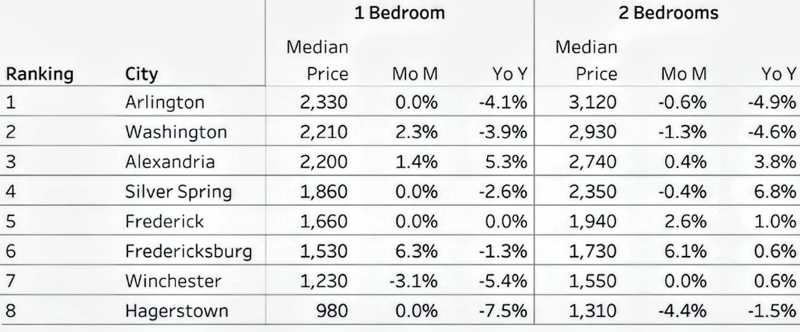 - In the District of Columbia, the median apartment rents of $2,210 and $2,930 were down 3.9% and 4.6%, respectively, year over year.