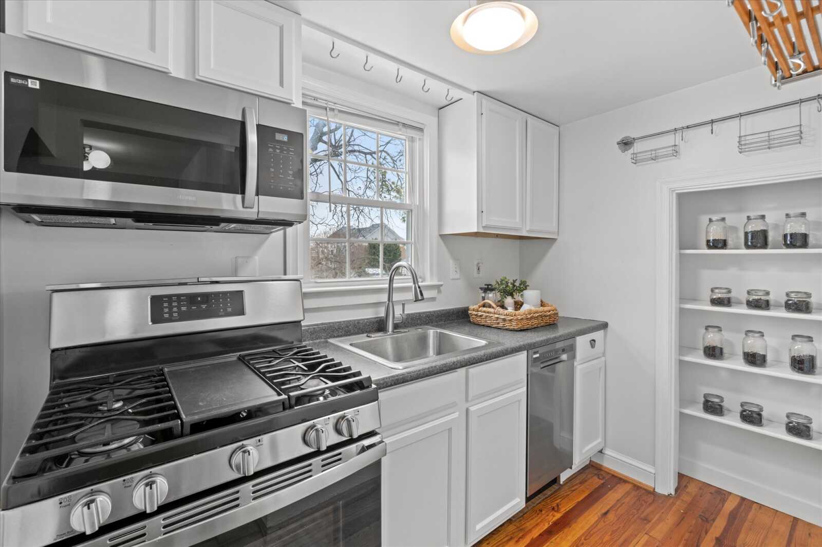 Adorable in all the right ways–sunlit rooms, crisp white kitchen, great closets. Small but mighty.