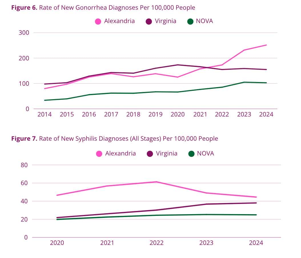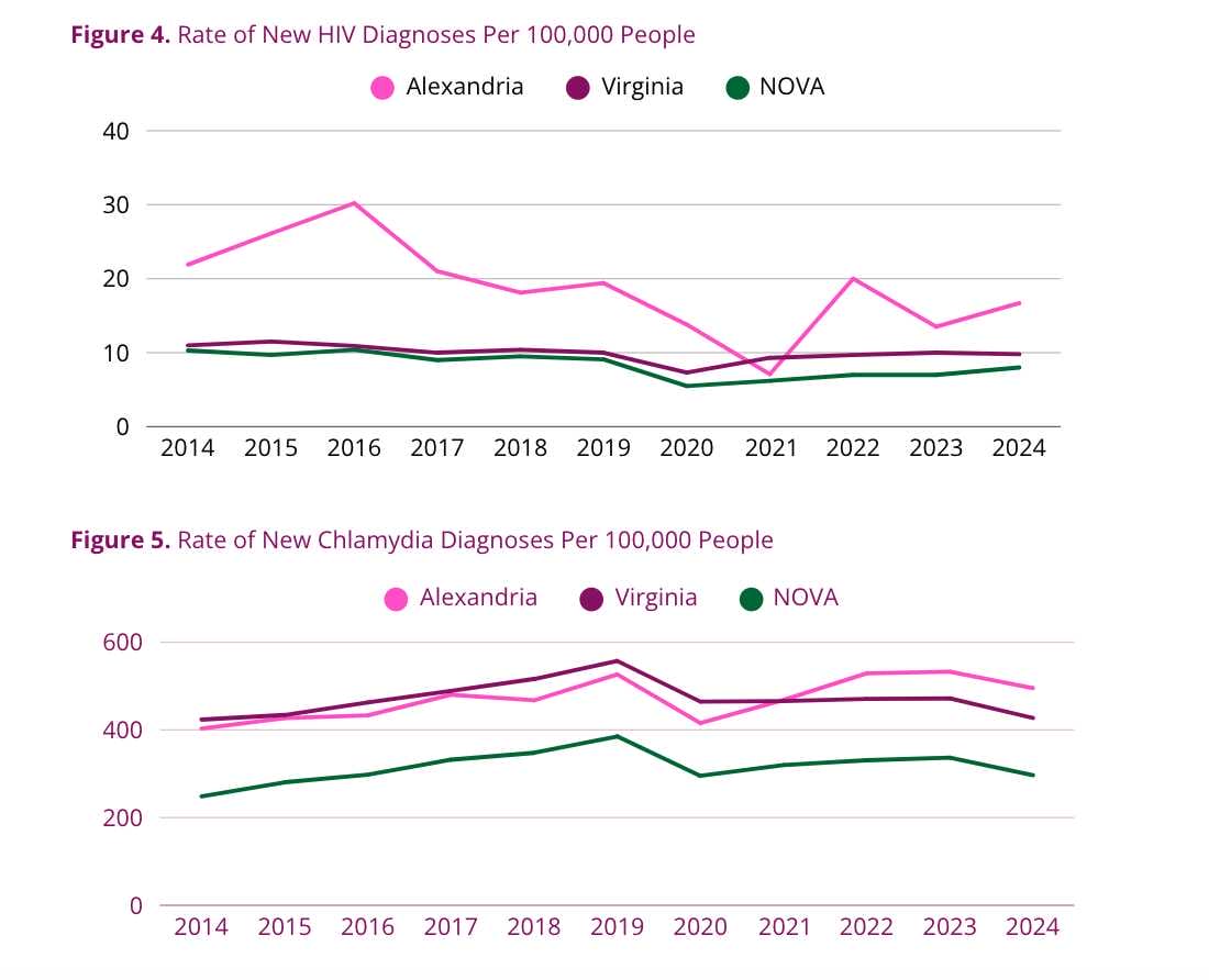 The Alexandria Health Department’s 2024 Disease Investigation Report recorded 1,900 separate disease investigations in 2024, a 5% decrease from 2023. The department found that vaccine-preventable diseases increased fivefold with 41 cases in 2024, compared to eight reported cases in 2023; and that sexually transmitted infections decreased 2%, although gonorrhea and HIV cases have increased by 9% and 24%, respectively.