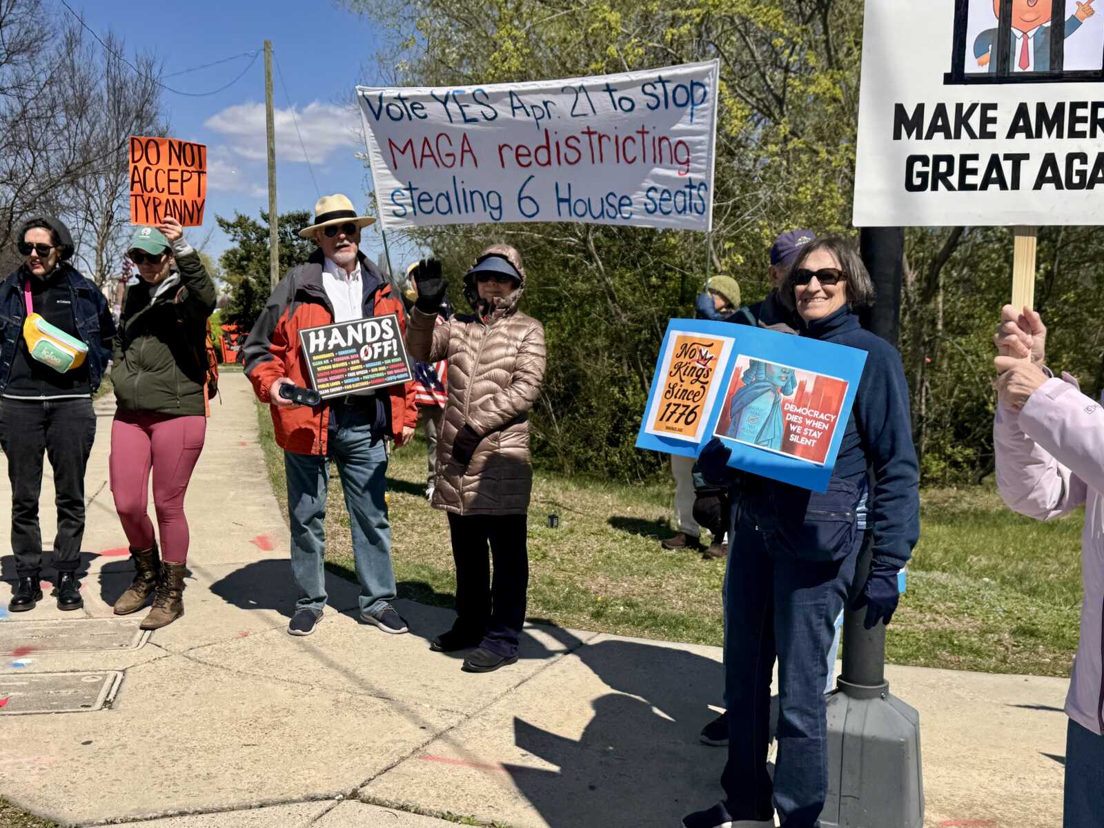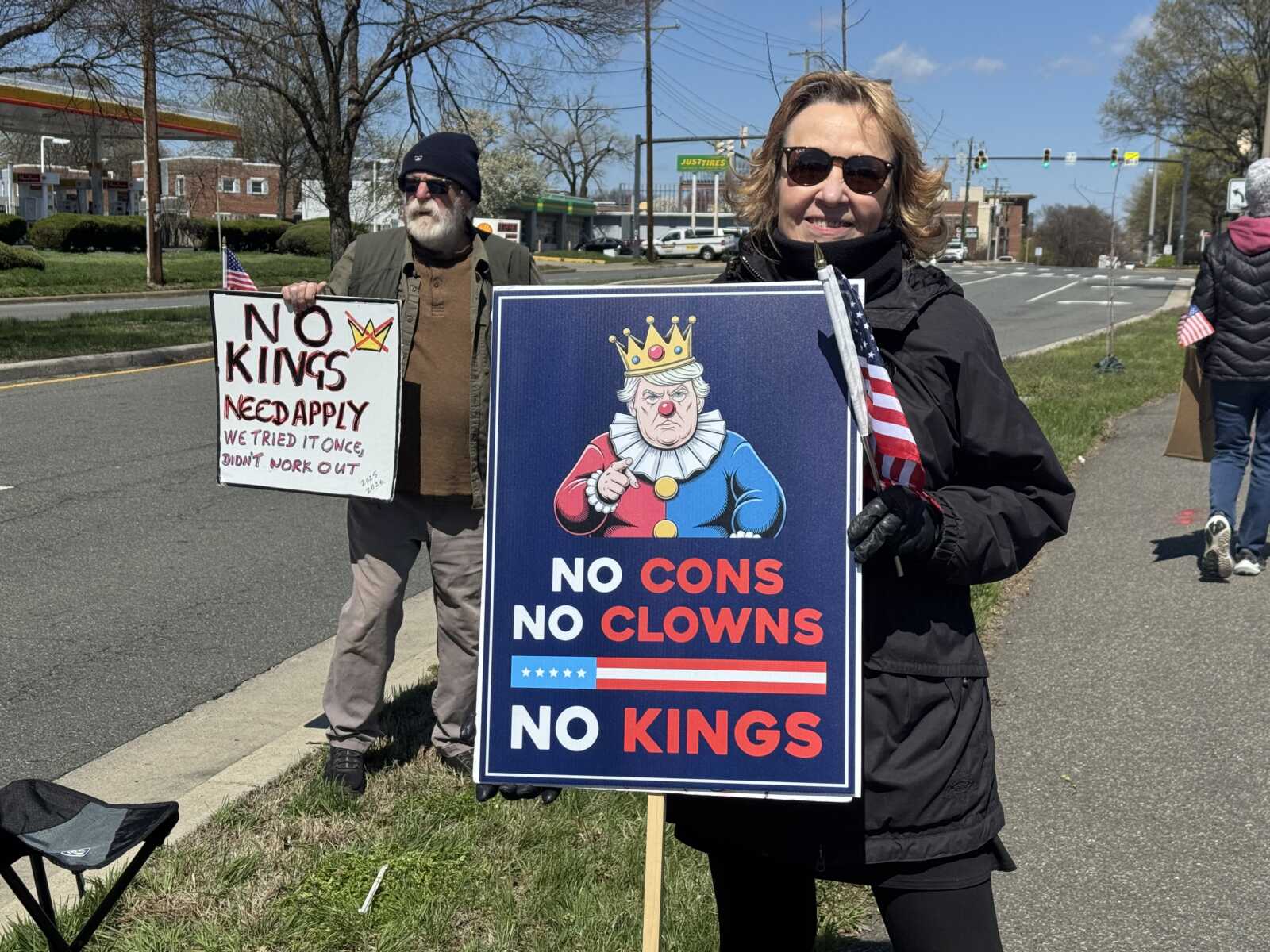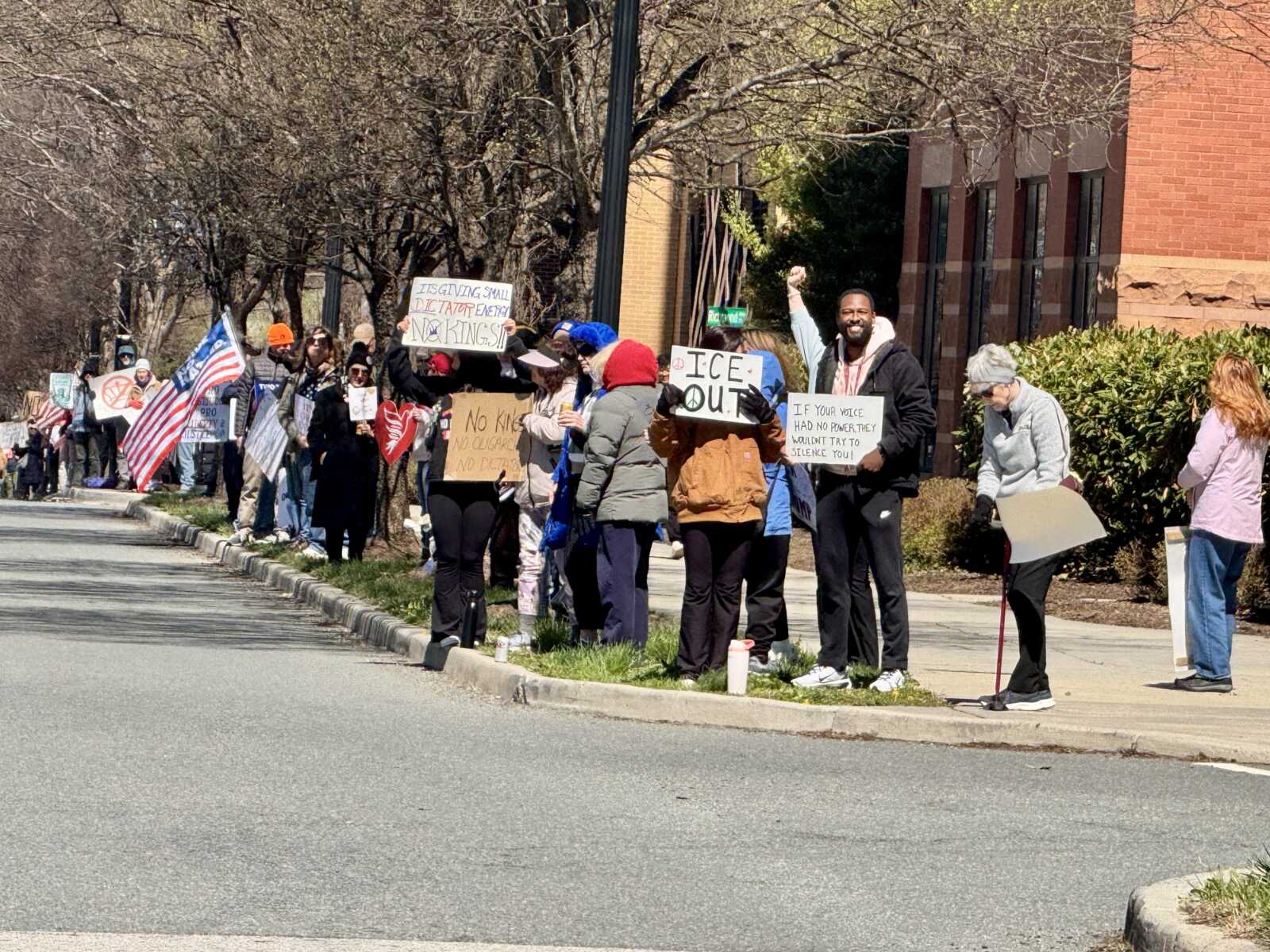 Indivisible Do Something Alexandria hosted the “No Kings 3” protest from 11 a.m. to 1 p.m. along northbound Richmond Highway from Powhatan Park to the Potomac Yard Shopping Center. Protestors held signs and encouraged drivers to honk in solidarity. While the event didn’t have speakers like the past two protests at Market Square in Old Town, Rep. Don Beyer (D-8) and state Sen. Elizabeth Bennett-Parker (D-39) made appearances at the “No Kings 3” protest.