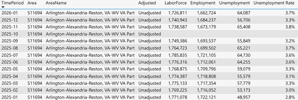 January 2026 Northern Virginia employment data (via Virginia Department of Workforce Development and Advancement)