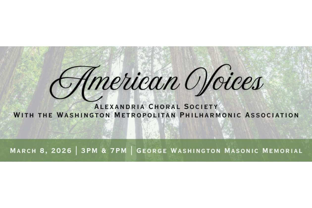 On Sunday, March 8th, join the Alexandria Choral Society and the Washington Metropolitan Philharmonic Association for “American Voices”, a performance that celebrates the diverse spirit of America as our country approaches its 250th anniversary. Featuring music by Gabriela Ortiz, Leonard Bernstein, and Jake Runestad, this concert presents a profound musical reflection on the past, present, and future of the American story. Performances at both 3:00pm and 7:00pm. Tickets are $45 for adults and $5 for kids. Learn more at www.alexandriachoralsociety.org/american-voices