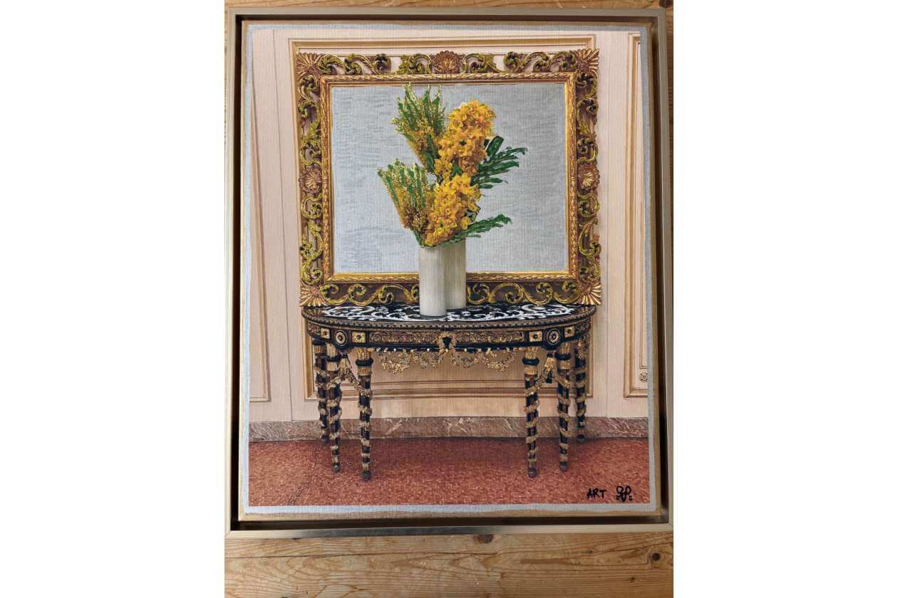 Featuring Alfa’s work called”Plaza Hotel”- a customized mixed media painting – Acrylic paint over canvas with rhinestone and crushed diamond accents. Artist statement: there is beauty everywhere.