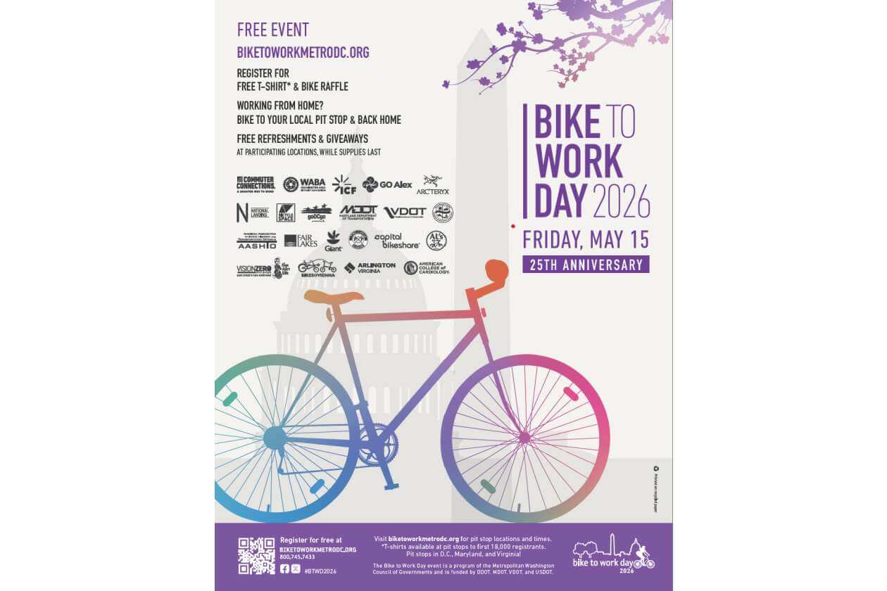 Join a free bike convoy, find a ride buddy, or ride solo this Bike to Work Day, and stop by one of more than 100 plus pit stops for free giveaways, food, and beverages, while supplies last, plus a chance to win a bike raffle and other prizes. For free registration and event updates, please visit https://www.biketoworkmetrodc.org/. Follow Commuter Connections on X at @BikeToWorkDay and use #BTWD2026 and on Facebook at Bike to Work Day.