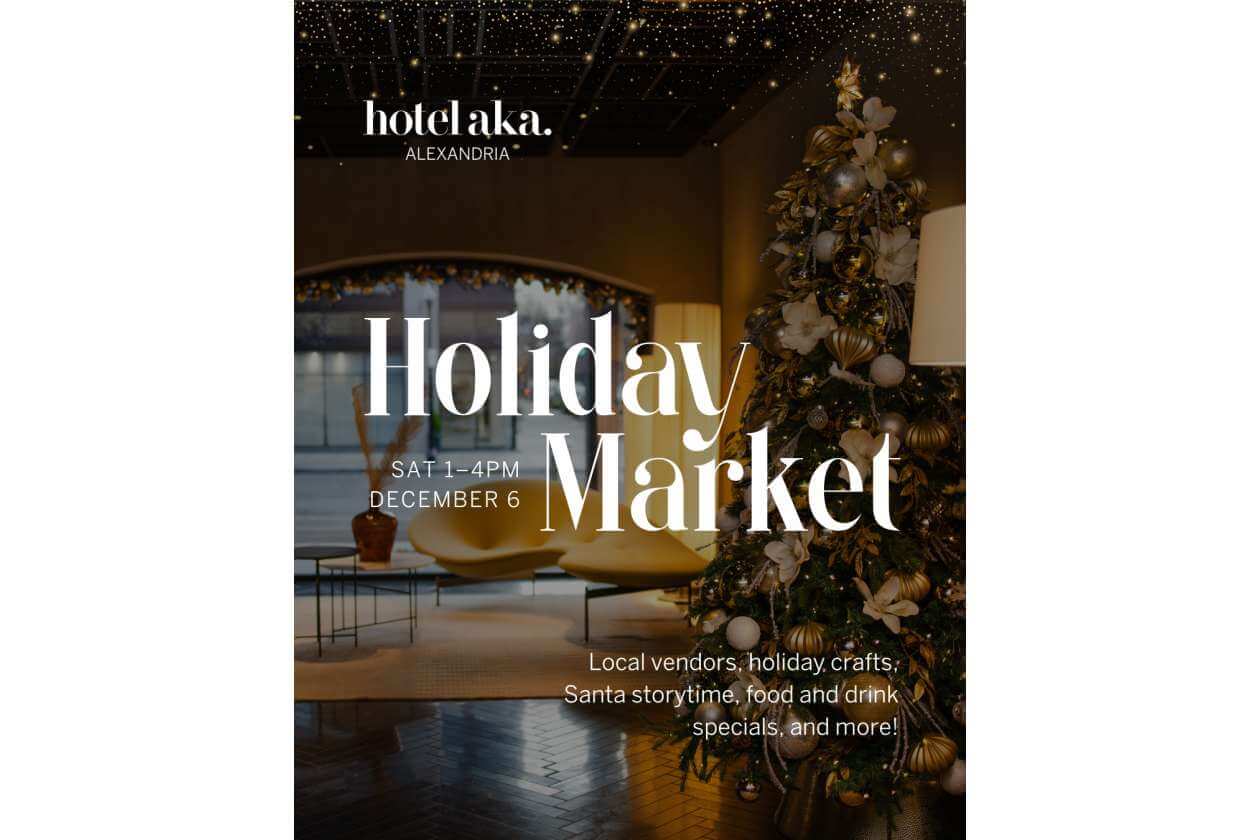 Celebrate the season at Hotel AKA Alexandria’s Holiday Market! Enjoy a festive afternoon of local shopping, seasonal food and drink specials from a.lounge, and holiday cheer. Featured local vendors include: Old Town Flower Gal, Lumos Collective, White Lily Shoppe, Eries Interiors, Isle & Wild, Galleria GeorgiAna, Pisces Moon Permanent Jewelry, Lalita Method.