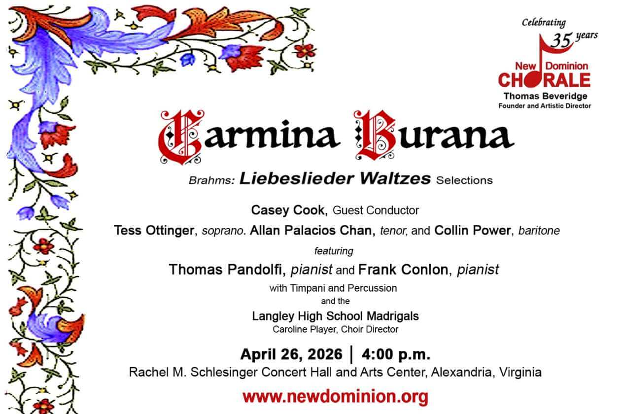 Join New Dominion Chorale for Carl Orff’s Carmina Burana, a lively celebration of springtime love, fickle fortune, and the joys of the hunt. Poems from a 13th century manuscript come to emphatic life in this modern song cycle, with percussion, dual pianists Thomas Pandolfi and Frank Conlon, renowned soloists Tess Ottinger, Allan Palacios Chan, and Collin Power, the Langley HS Madrigals, joining New Dominion Chorale and guest conductor Casey Cook for this wonderful piece. The concert also features selections from Johannes Brahms’ Liebeslieder Waltzes—passionate, funny, and wry love songs for your spring afternoon. This sparkling program was arranged by New Dominion Chorale’s Founder and Artistic Director of 35 years, Thomas Beveridge.